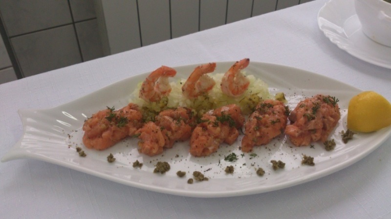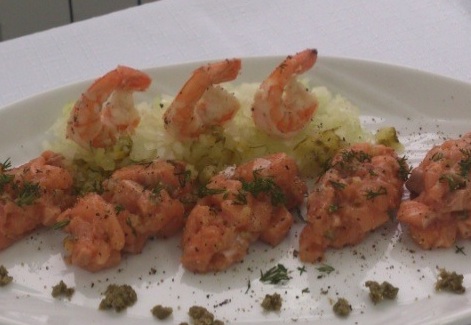 Befsztyk tatarski ze świeżego łososia z krewetką