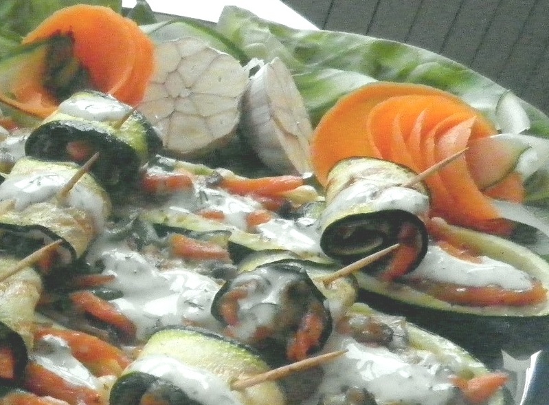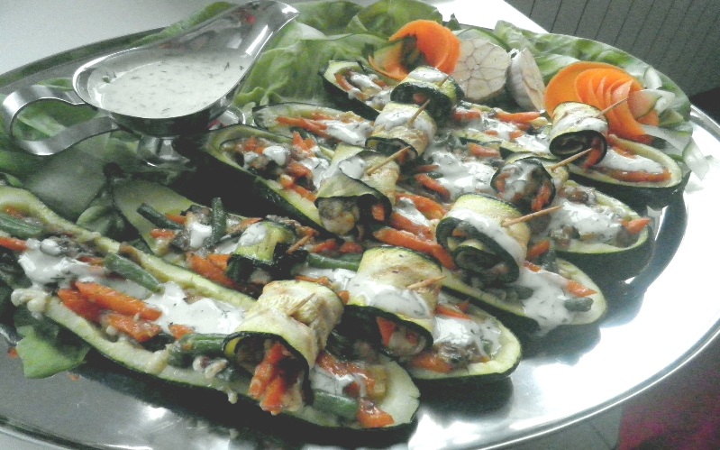 Należy przeprowadzić obróbkę wstępną brudną i czystą warzyw (marchew pokroić w zapałkę, pieczarki w plastry, zaś cebulę w piórka). Na rozgrzanej oliwie zarumienić 4 ząbki czosnku. Następnie wyjąć plasterki czosnku i kolejno wkładać: pieczarki (dusić do momentu, gdy woda wyparuje), cebulę, po chwili dodać marchewkę oraz fasolkę. Kiedy będą wystarczająco miękkie (nie rozpadające się) należy doprawić do smaku. W następnej kolejności dodać ser i dokładnie wymieszać. Przygotowany już farsz nakładamy w łódeczki. Przygotować plastry z czwartej cukinii i zawinąć je w roladki wraz z farszem (będą to maszty naszych łódeczek). Przygotowane już roladki i łódeczki zapiekamy w oddzielnych naczyniach ok. 15 min. w temp. 180 st. C.
