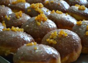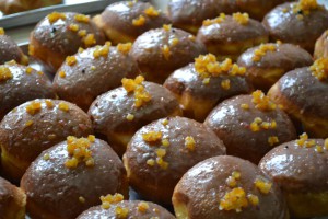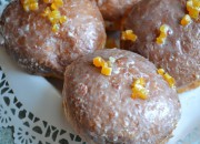 Posypujemy przesianym cukrem pudrem – tu też są lukrowane i posypane kandyzowaną skórką pomarańczy.