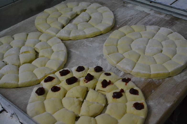 Z wyrośniętego ciasta, lekko natłuszczonymi dłońmi odrywamy małe kawałki ciasta, rozpłaszczamy na dłoni, nakładamy konfiturę, sklejamy dokładnie, zbieramy ciasto wokół konfitury, sklejamy dokładnie, aby utworzyła się niewielka kula