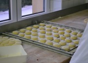 Układamy (zlepioną stroną do dołu) na posypanej mąką serwecie – tu na specjalnej tacy z listewkami żaluzyjnymi.