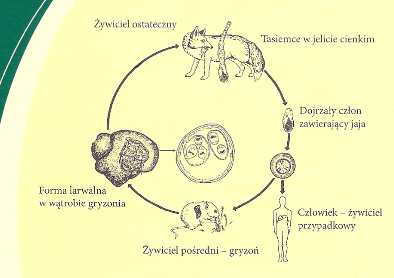Szczególnie niebezpieczny dla człowieka jest kał zarażonego lisa, w którym znajdują się jaja tasiemca. Cechują się one znaczną odpornością na warunki środowiska zewnętrznego oraz działanie środków chemicznych. Mogą przetrwać ponad rok w wysuszonym kale oraz długi czas w niskich temperaturach (kilkadziesiąt godzin w temperaturze minus 70 st. C).